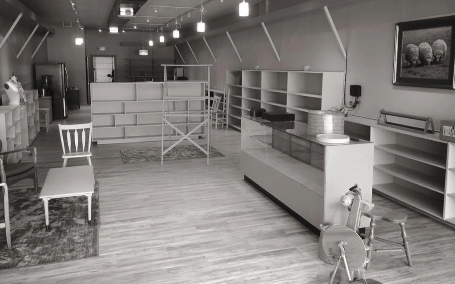 Here's a peek into the gallery, empty shelves for now, but that will soon be changing!